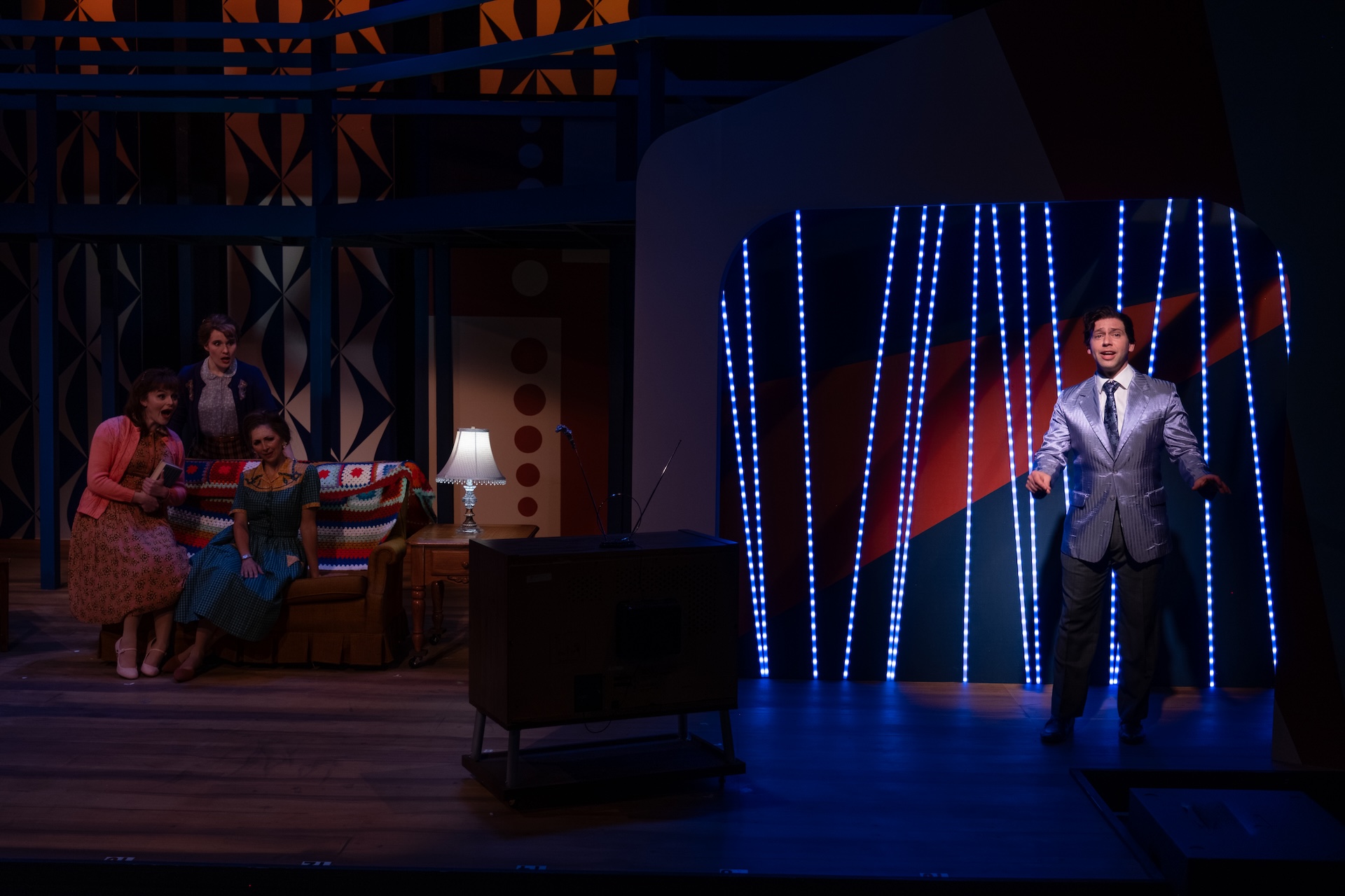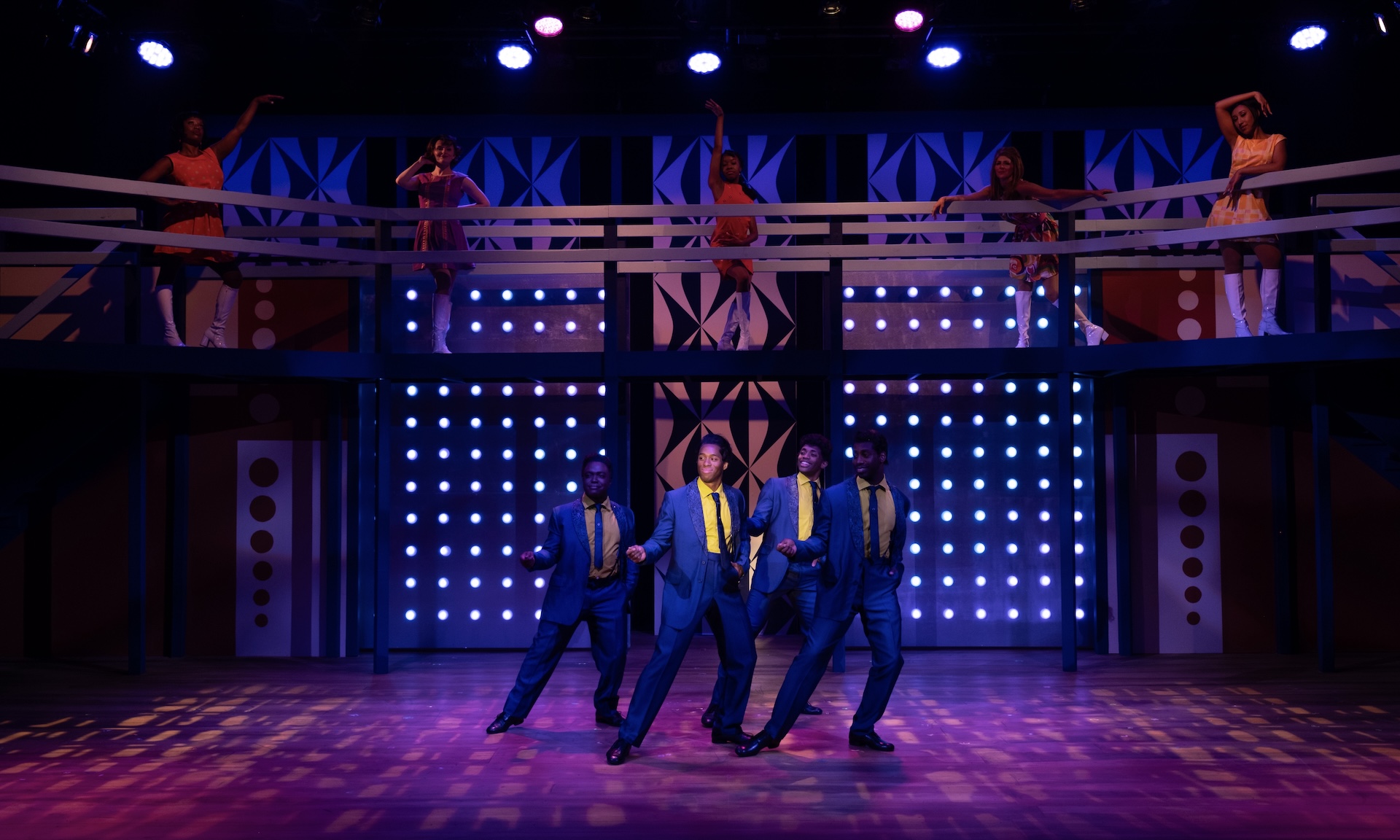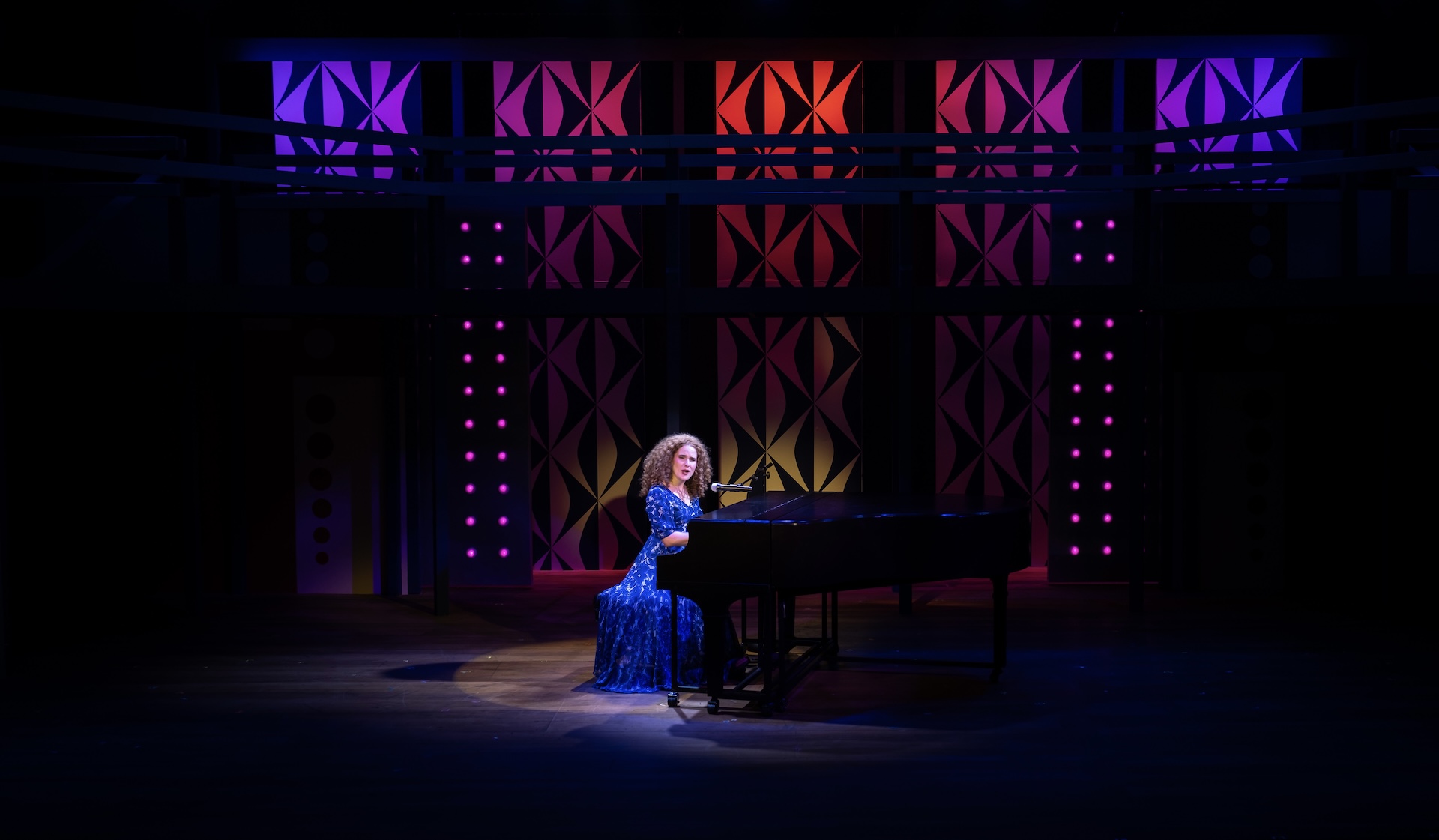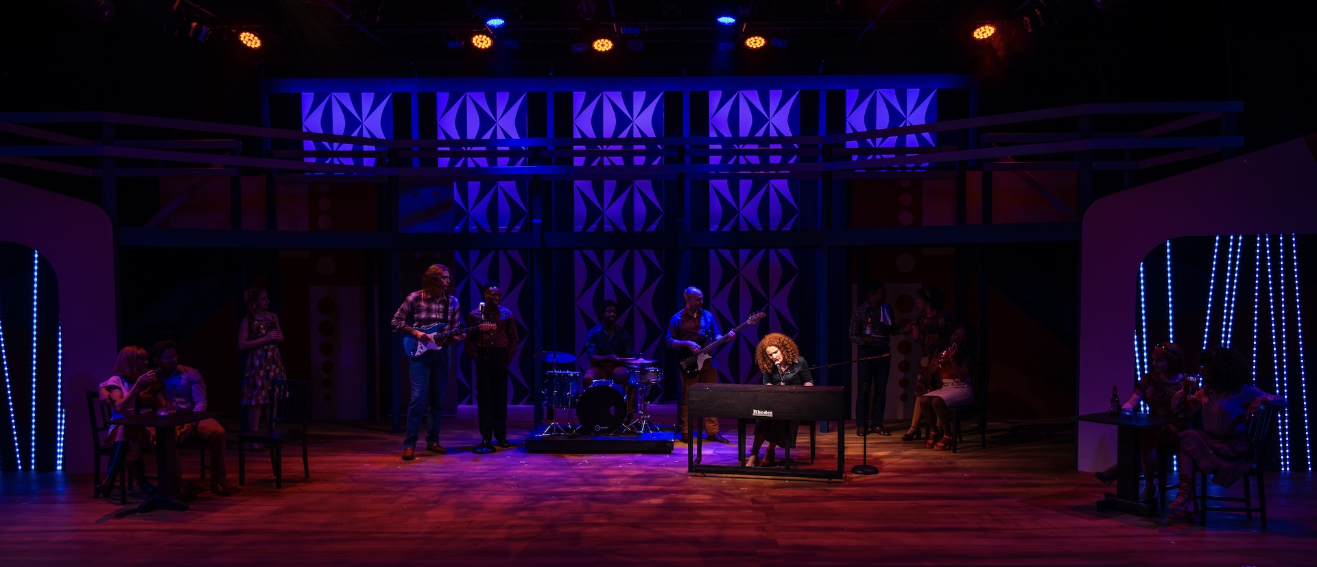 “A glorious, multi-level, Mid-Century-inspired set by Ranae Selmeyer that, beautifully lit by Jennifer Kules, effectively shifts between glitzy concert performances and intimate interior scenes, thanks in part to lightining-quick scene transitions.”