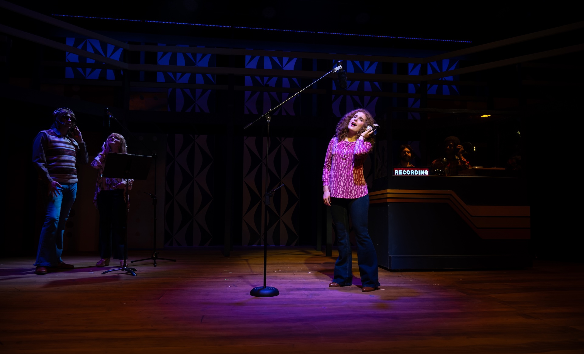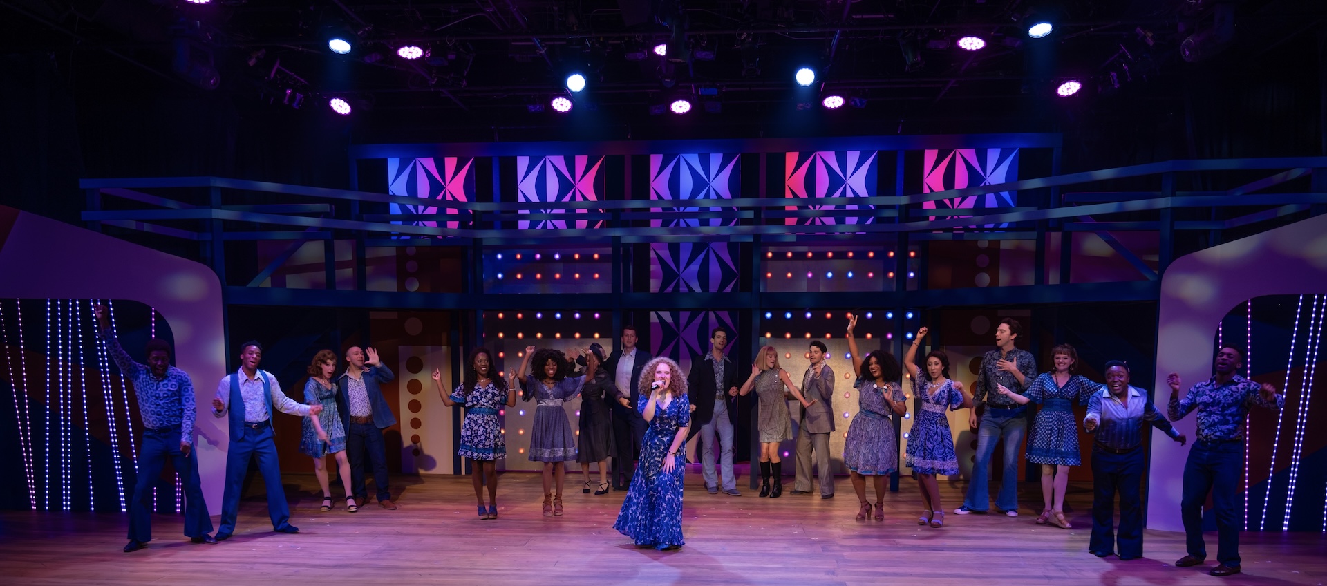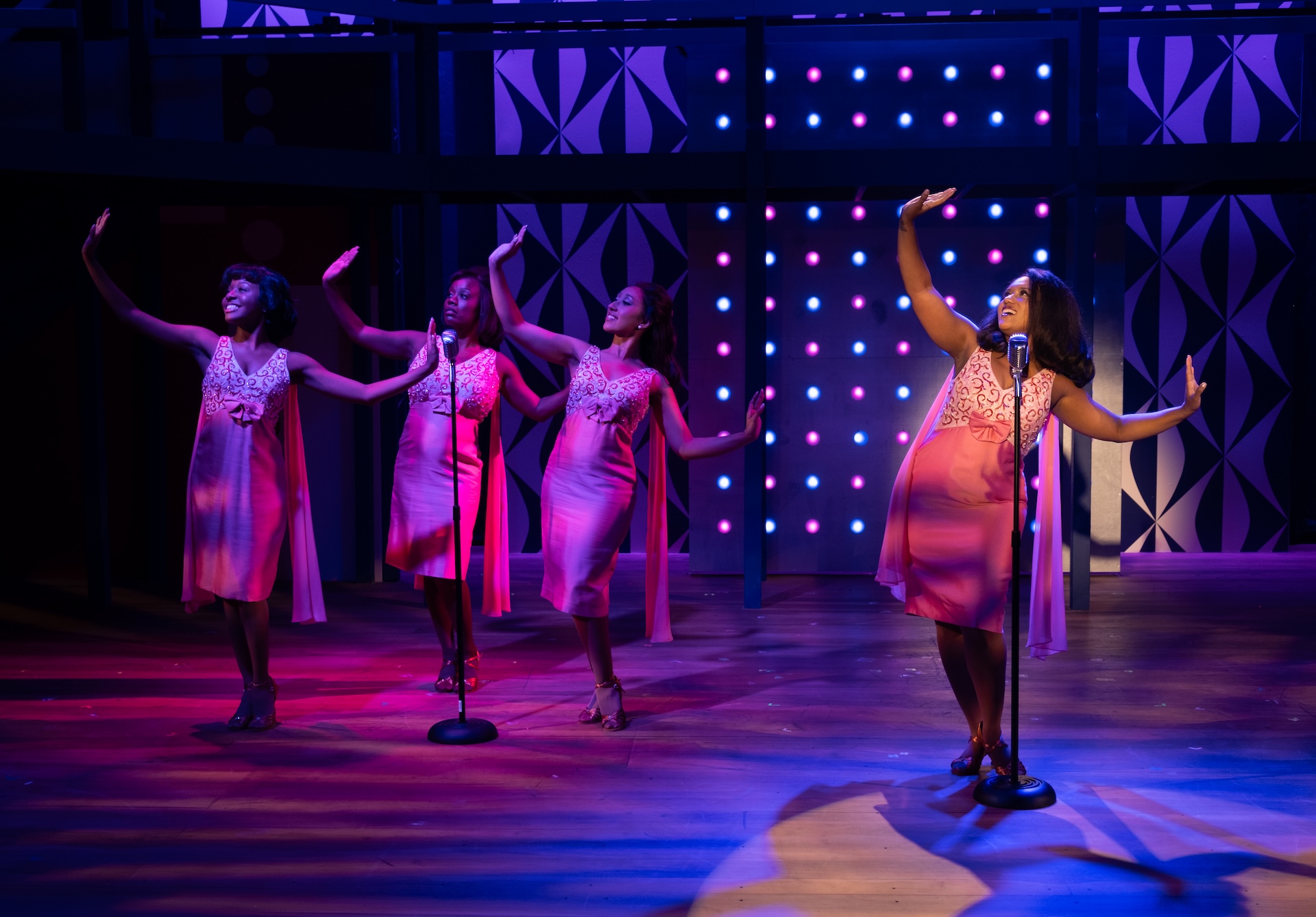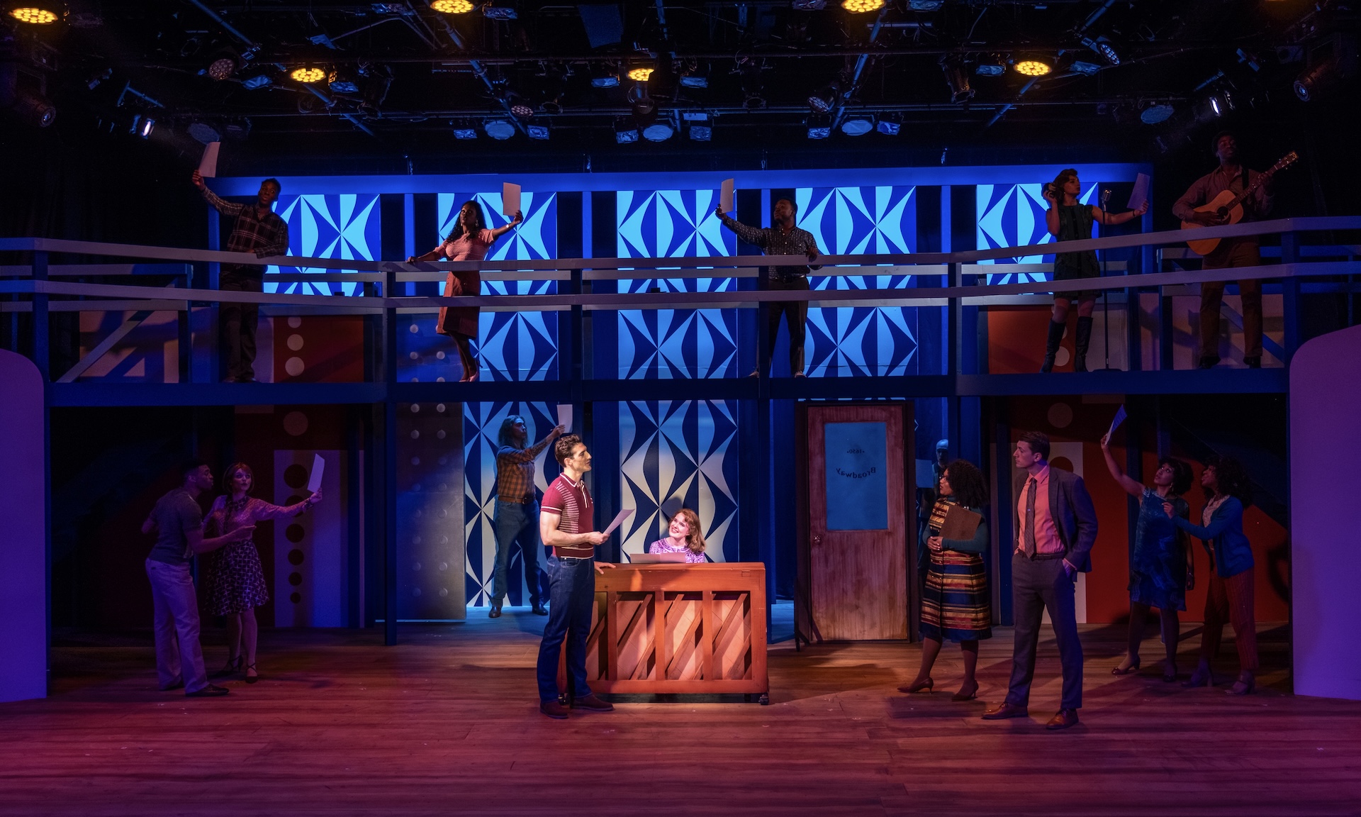 “A glorious, multi-level, Mid-Century-inspired set by Ranae Selmeyer that, beautifully lit by Jennifer Kules, effectively shifts between glitzy concert performances and intimate interior scenes, thanks in part to lightining-quick scene transitions.”